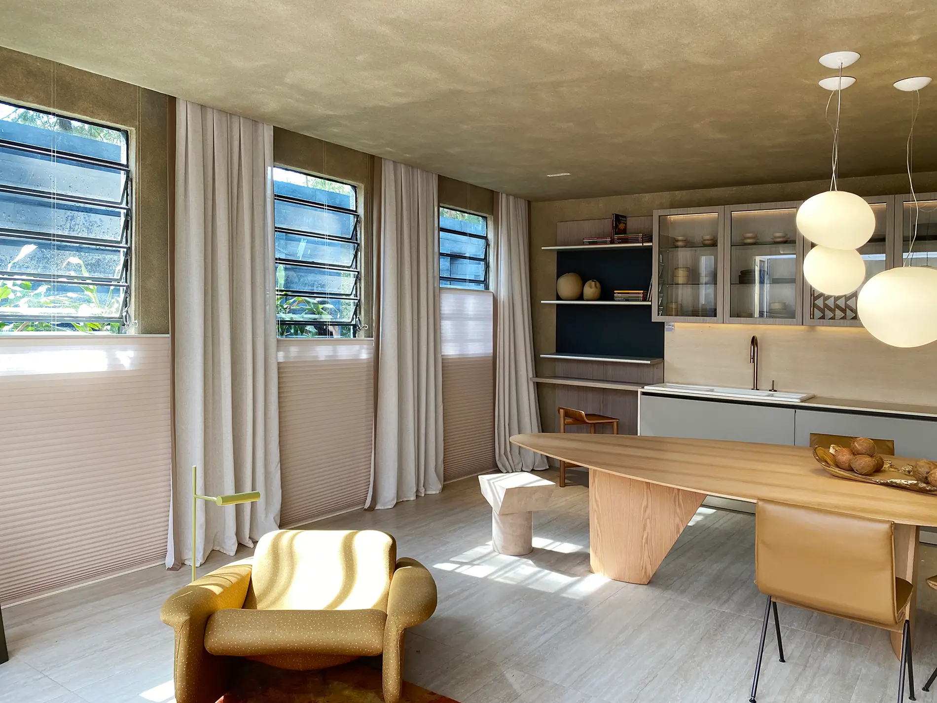 Estrutura composta por células que remetem a favos de mel e permitem absorção acústica e conforto térmico reduzindo a entrada de calor no verão e diminuindo a fuga de calor durante o inverno. O tratamento antiestático impede o acúmulo de poeira. Possui tecidos translúcidos e blackout 100% poliéster com células de 25 e 45mm.