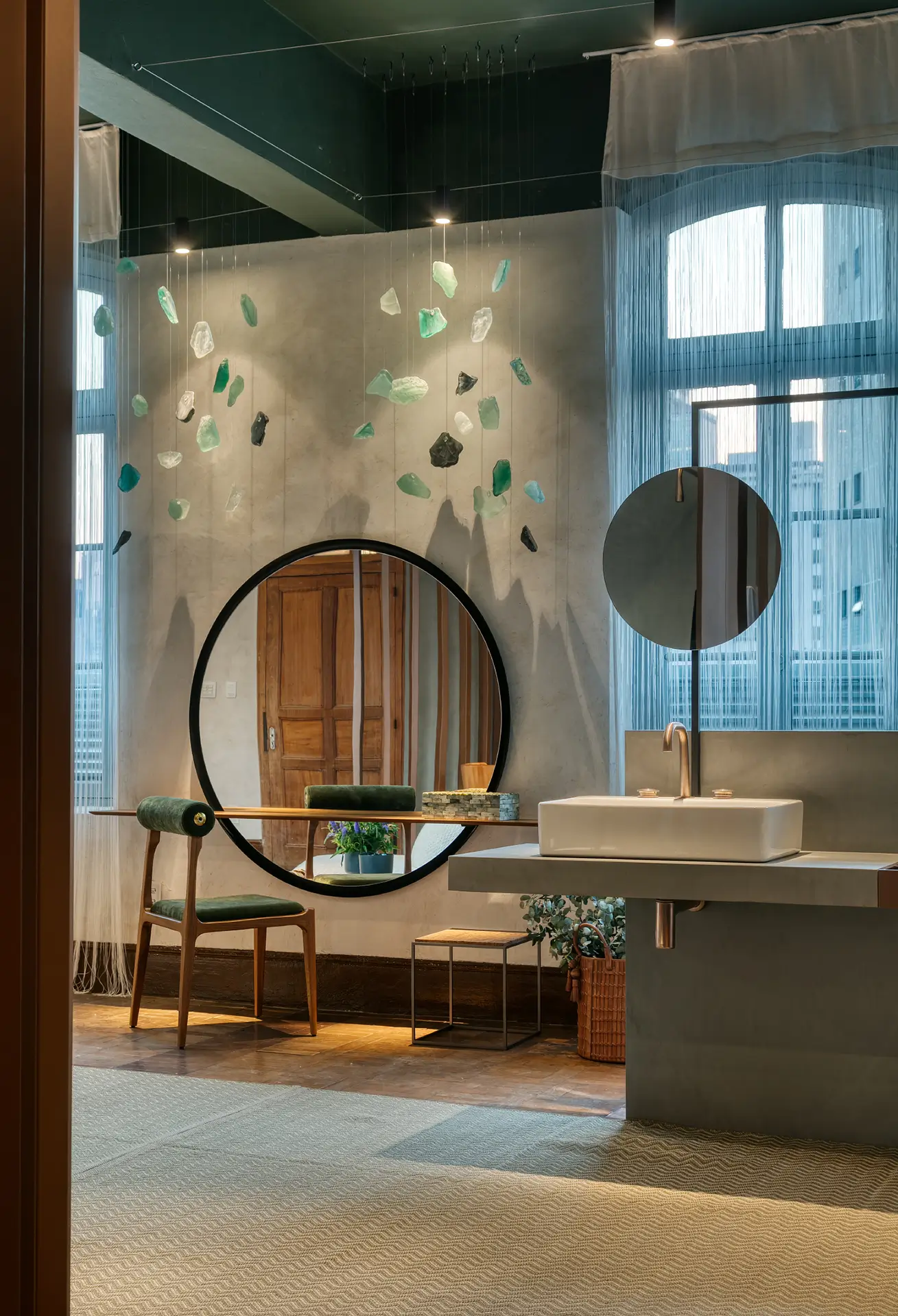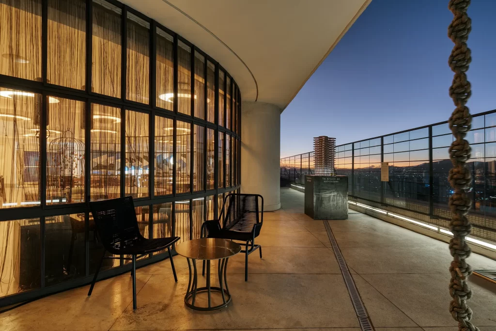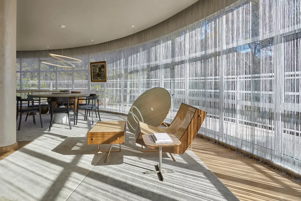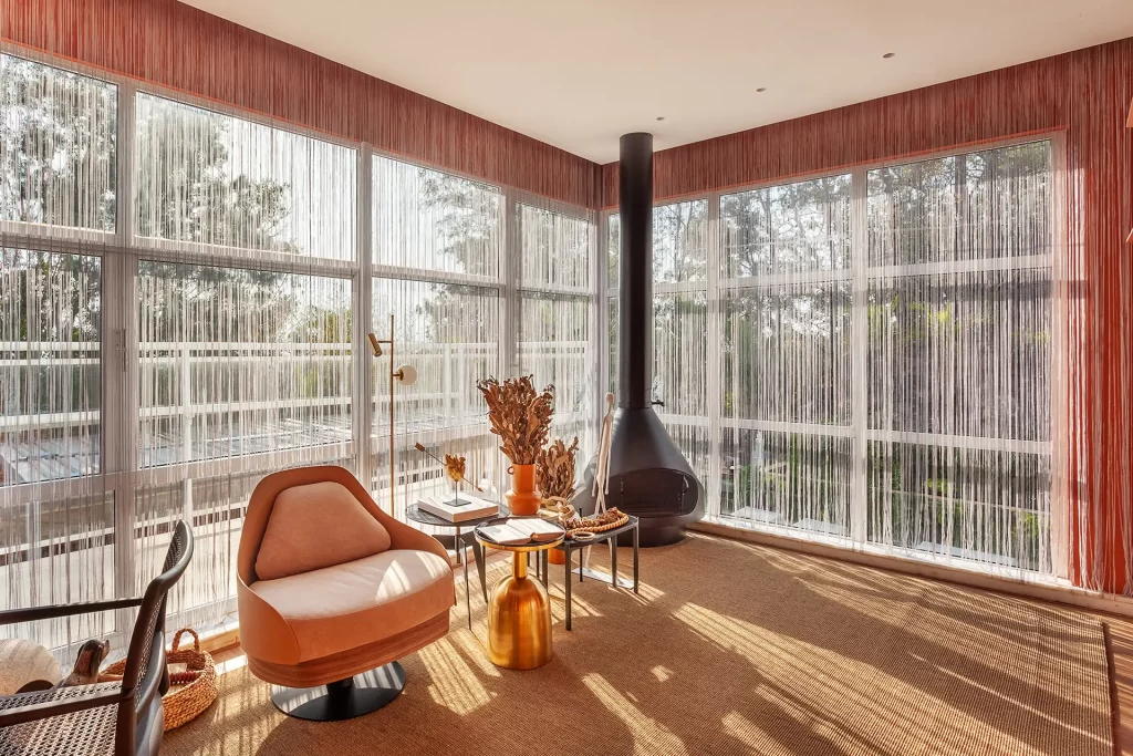 Cortina em tecido de poliéster com franjas que fica perfeita em grandes áreas envidraçadas. Contemporânea e sofisticada. Ela pode ser manual ou motorizada.